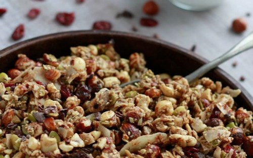 - Pulse hazelnuts, cashews, pumpkin seeds, and sunflower seeds in food processor a few times until broken up a bit. Dump into large bowl.